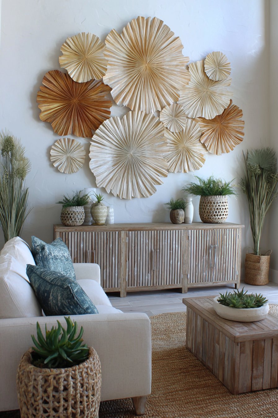 Whitewashed shiplap creates a stunning accent wall that brightens the entire space instantly. A collection of woven palm frond art pieces adorns this architectural feature beautifully. The natural fiber artwork brings authentic tropical craftsmanship into contemporary residential design. This approach honors traditional island artistry while maintaining clean, modern sensibility.