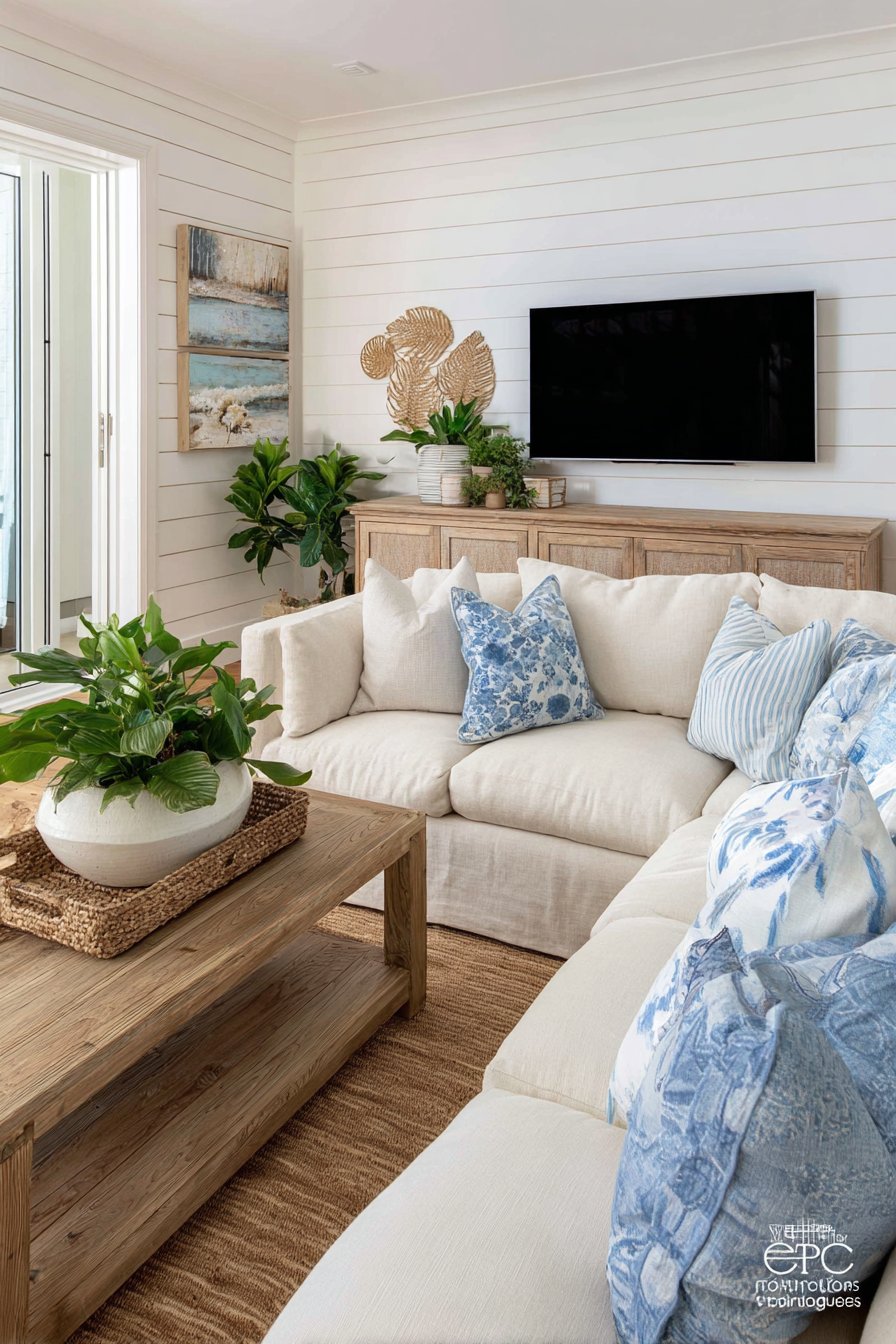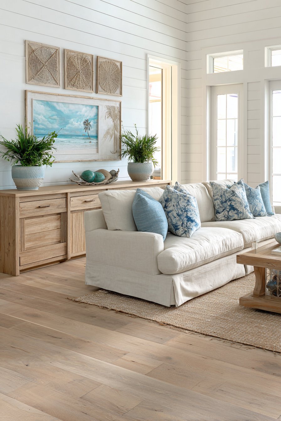 A low-profile teak media console showcases visible wood grain patterns that develop character over time. Ceramic planters holding tropical greenery sit atop the naturally beautiful furniture piece. The creamy linen sofa faces this natural wood focal point across the room. Batik-printed cushions in ocean blues and sandy neutrals connect coastal themes to tropical aesthetics seamlessly.