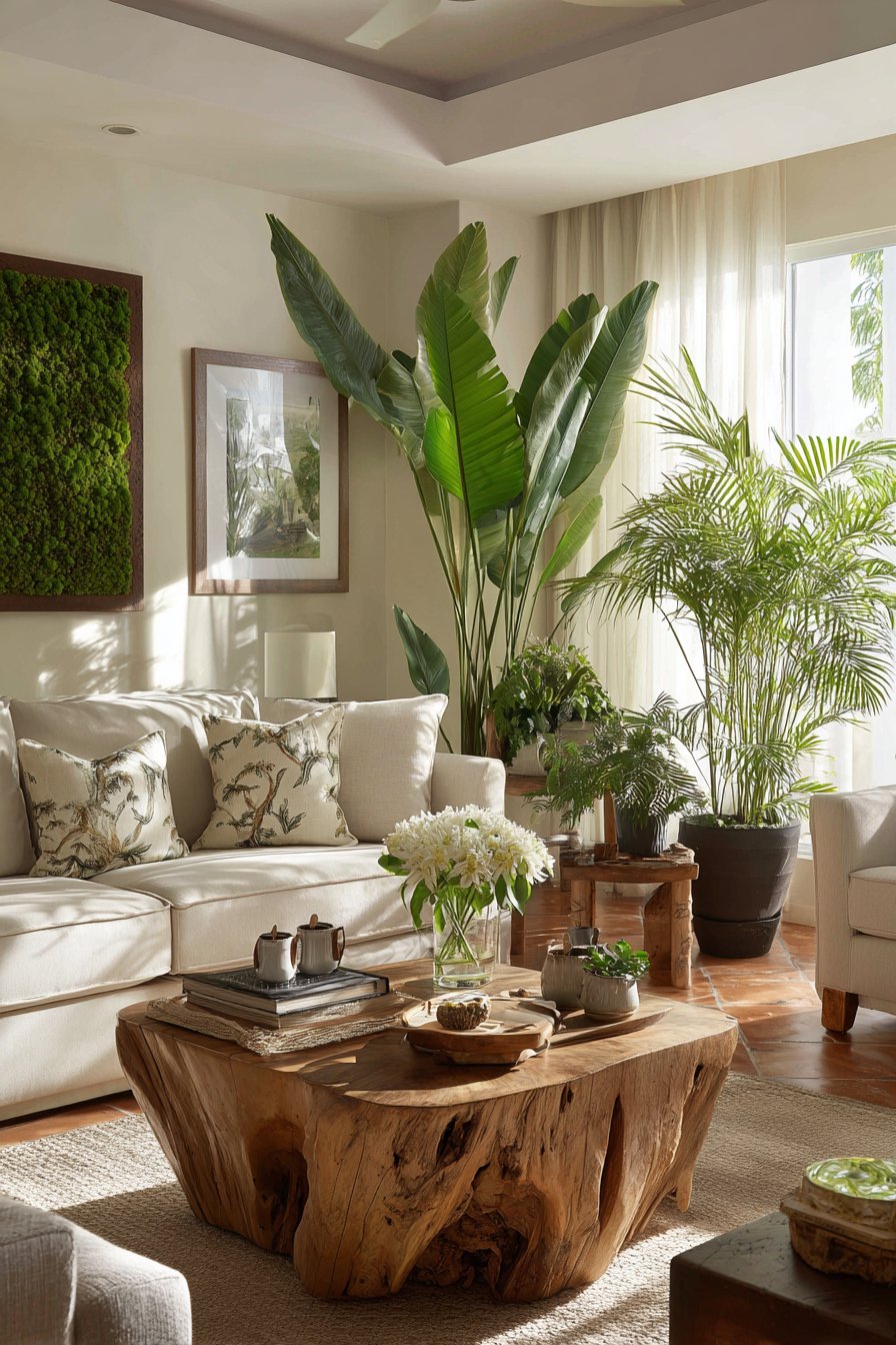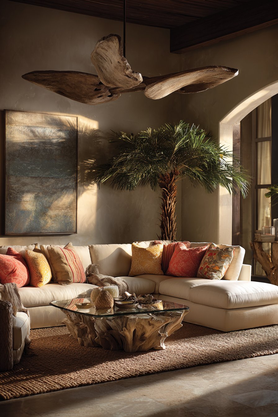 Chunky braided jute rugs define seating zones beneath unique coffee tables. These pieces crafted from single teak root slices with glass tops showcase natural sculptural beauty. The organic forms bring nature’s artistry indoors as functional furniture. Travelers palms provide architectural plant presence with dramatic fan-shaped foliage.