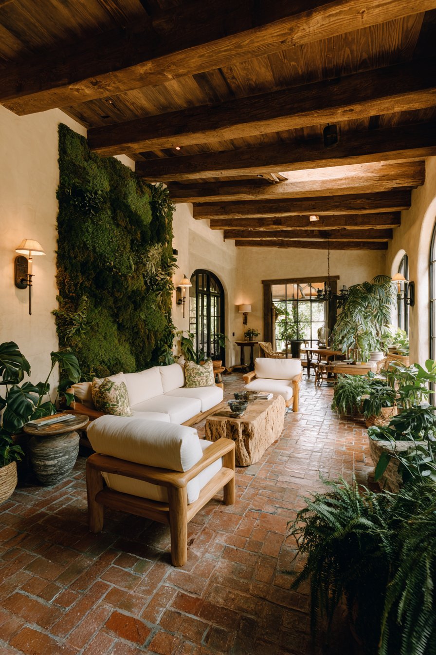 Reclaimed terracotta tile flooring shows beautiful age variations that new materials lack. The salvaged materials prevent landfill waste while offering irreplaceable character. Large potted palms and ferns in biodegradable planters complete eco-conscious design approaches. The natural containers decompose rather than persist as plastic waste indefinitely.
