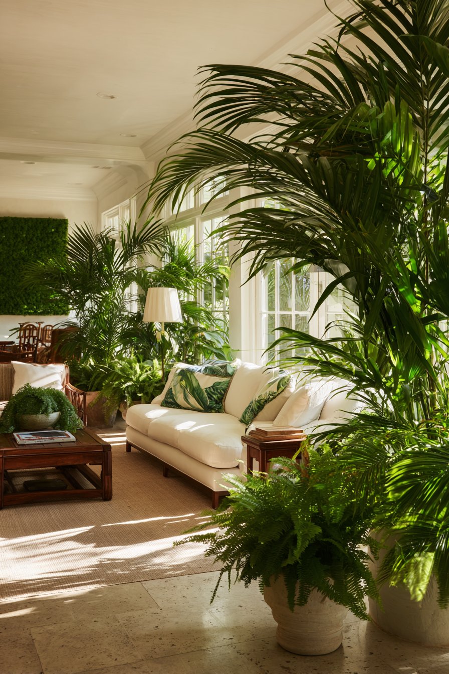 - Position large tropical plants strategically to create focal points and natural room division