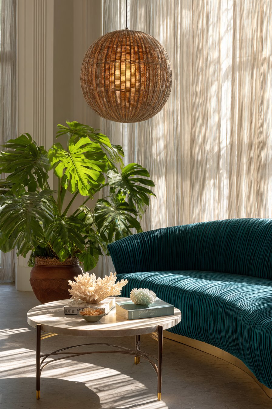 Monstera deliciosa plants cast dramatic shadows on cream-colored walls throughout the day. The large distinctive leaves create ever-changing natural artwork as sunlight shifts. Terracotta pots add earthy warmth that complements both velvet and rattan beautifully. Natural fiber pendant lights hang above, their woven construction echoing the coffee table’s organic texture.