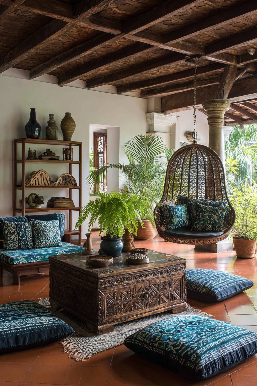 Low seating arrangements with floor cushions in indigo batik fabric surround carved wooden trunks. These versatile pieces serve as both coffee tables and additional storage solutions. The low profile creates intimate, relaxed conversation areas perfect for casual gatherings. Terracotta tile flooring adds warmth and authentic tropical character underfoot.
