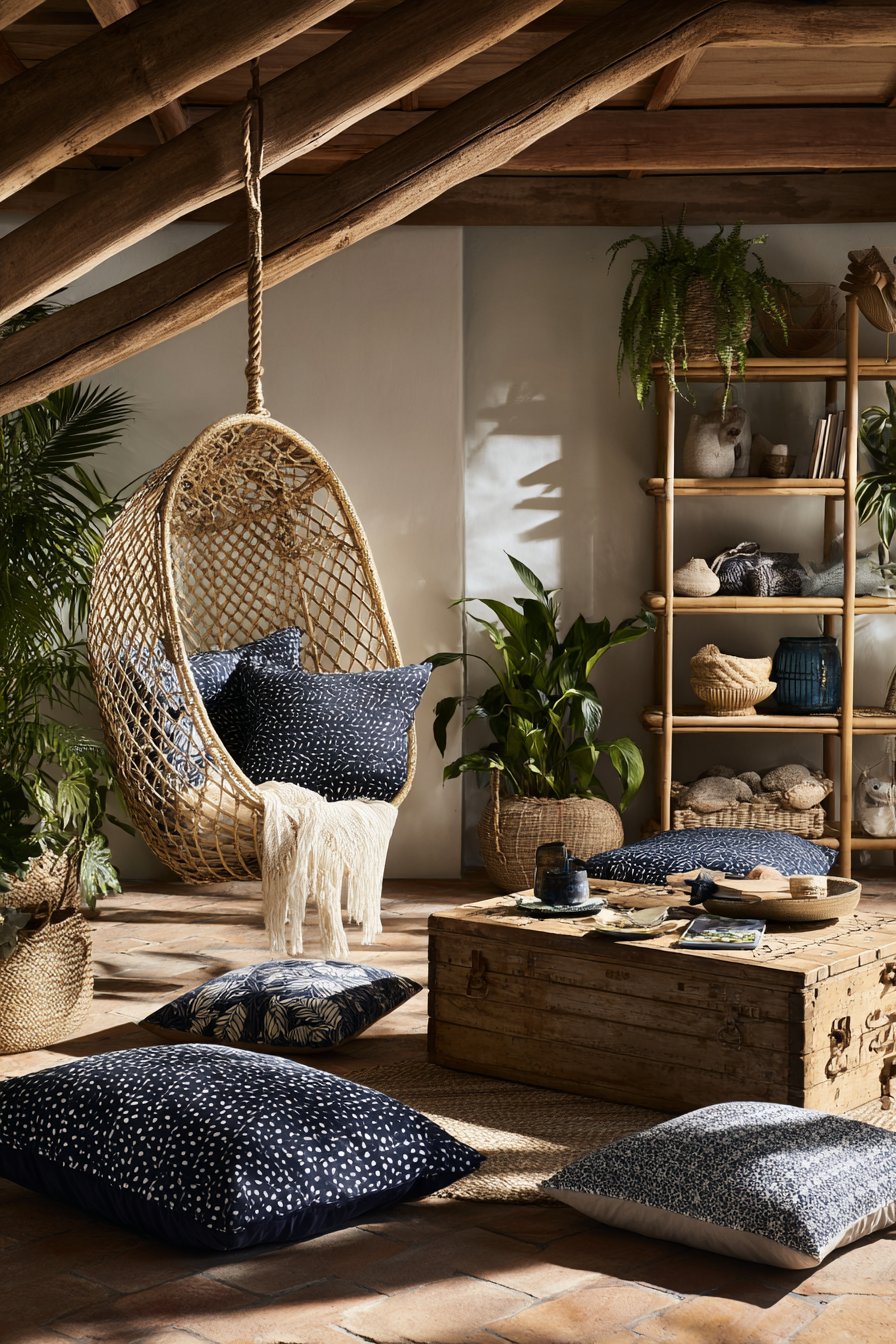 An open-weave rattan hanging chair suspended from exposed wooden ceiling beams creates an instant focal point. Macramé cushions and tropical print fabrics fill the suspended seat with comfort. This playful furniture choice brings youthful energy and relaxed island vibes. The hanging element adds vertical interest while maintaining open floor space below.