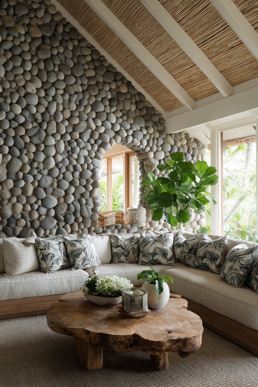 Exposed bamboo ceiling treatment creates stunning overhead architectural interest throughout the living space. The natural material adds warmth while maintaining height and openness. River rock accent walls behind seating areas provide dramatic textural contrast. These substantial natural elements anchor the room with authentic tropical materiality.