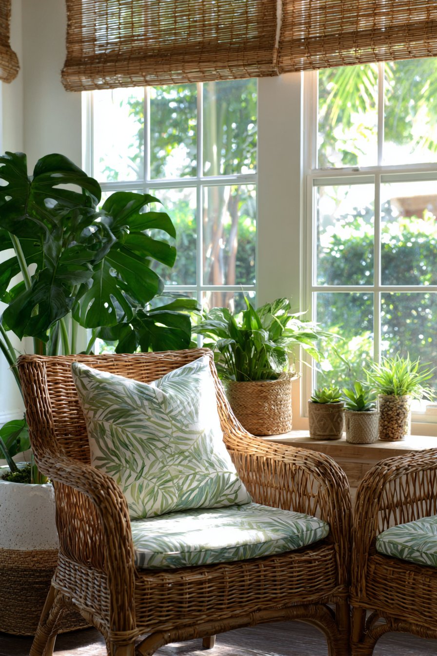 Natural fiber roman shades filter bright tropical sunlight entering through compact windows. The woven texture adds visual interest to necessary window treatments. Balanced exposure lighting ensures the space feels bright despite smaller dimensions. The thoughtful approach proves tropical style works beautifully in apartments and smaller homes.