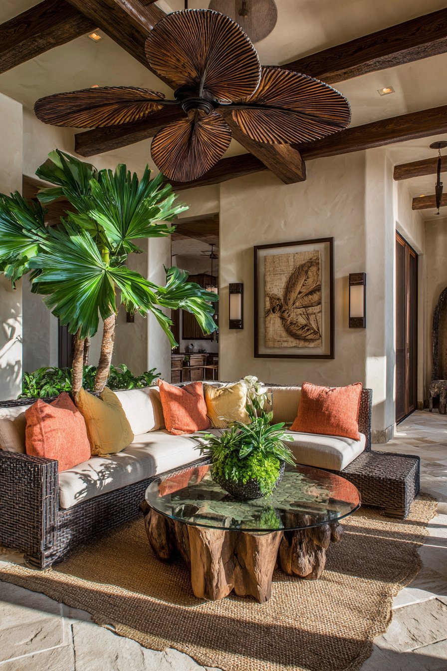 A ceiling fan featuring wide palm-shaped blades in weathered teak finish creates functional sculpture overhead. The substantial fixture provides essential air circulation while serving as design focal point. Below, low-profile sectionals in undyed cotton canvas create neutral, relaxed foundations. Tropical accent pillows in turmeric yellow and coral pink add cheerful color pops.