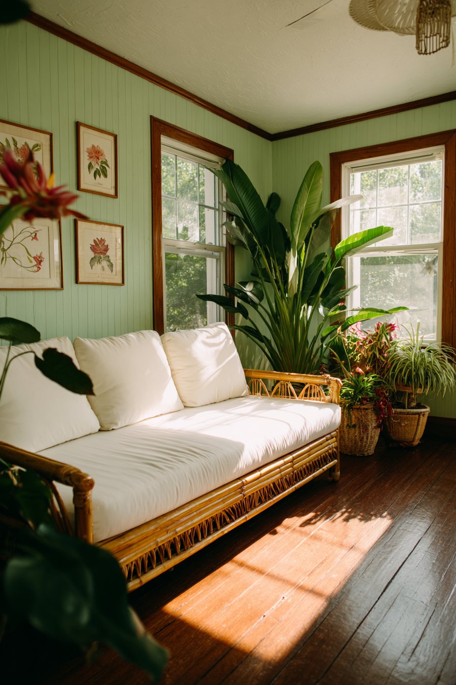 This design showcases how paint color dramatically transforms spaces into tropical retreats. The seafoam green creates cohesive backdrops that unify diverse furniture pieces. Natural materials prevent painted surfaces from feeling flat or artificial. The combination achieves an authentic tropical character through thoughtful color and material selection.