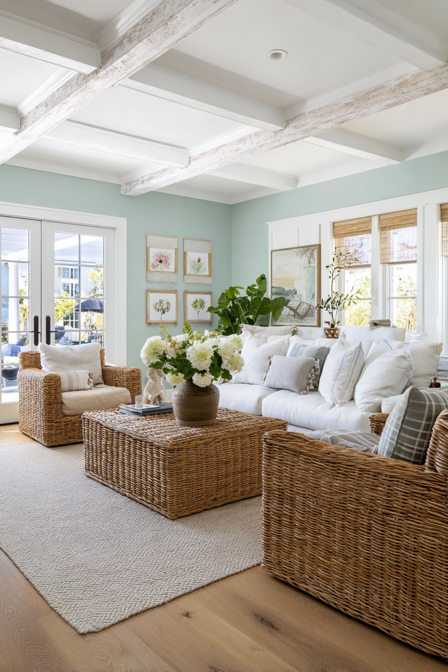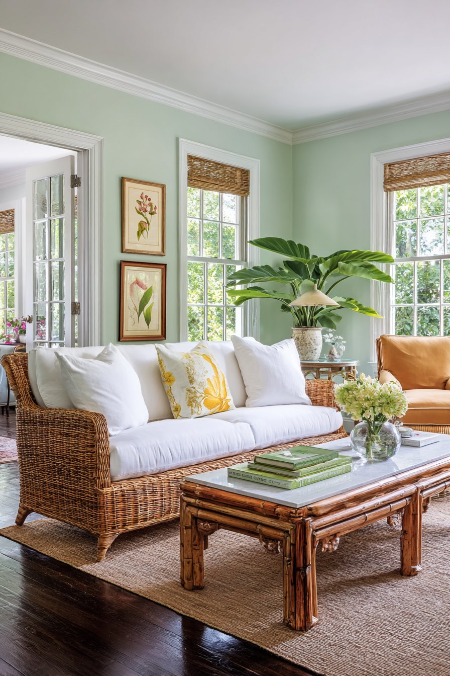 Walls painted in soft seafoam green create an instant tropical atmosphere throughout the living space. The cool, calming hue evokes ocean waters and tropical horizons. Bamboo-framed windows complement the painted surfaces while adding natural material warmth. Natural rattan furniture includes sofas with thick white canvas cushions that feel crisp and fresh.